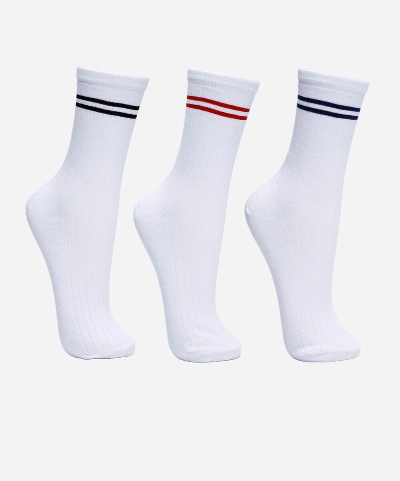 Kit de três pares de meias confeccionado em malha com algodão com estampa listrada. O modelo é cano alto com caimento ajustado e acabamento canelado na parte superior.