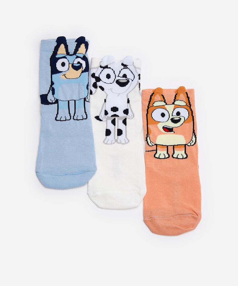 • Kit com três pares de meias de cano curto com estampas dos personagens de Bluey.