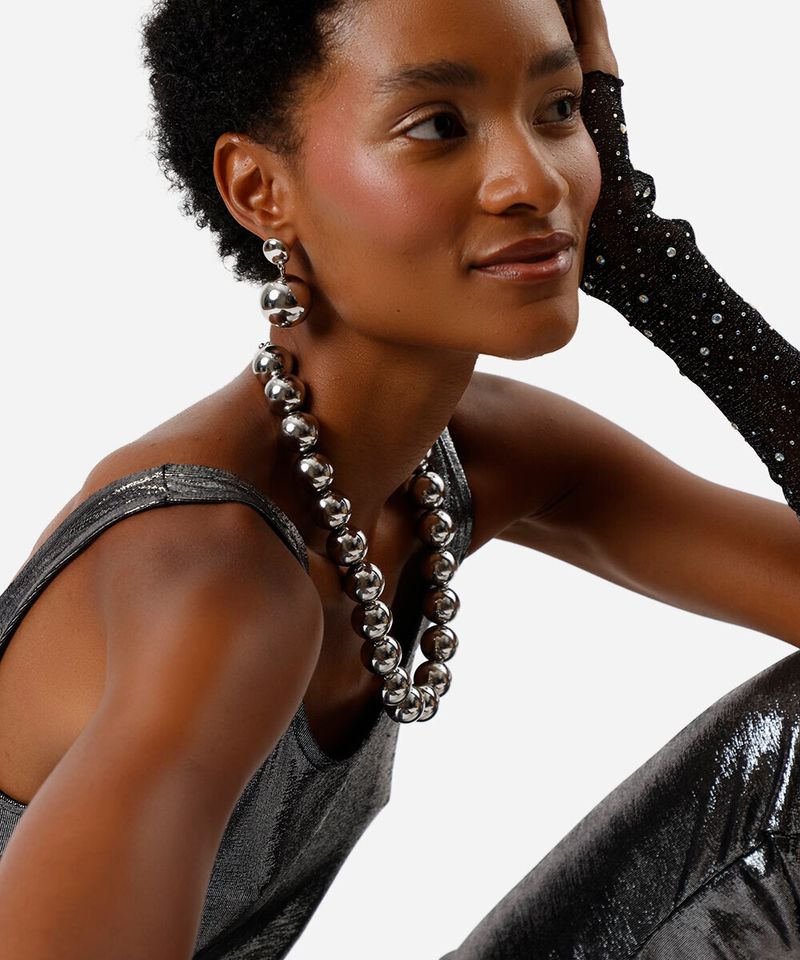 Kit de colar e par de brincos desenvolvidas em pérola artificiais com efeito metalizado. O colar tem fechamento por mosquetão e corrente com níveis de ajuste. O par de brincos possui fechamento por tarraxa. Este é um acessório hipoalérgico livre de níquel. Evite contato com água, cosméticos e produtos químicos. Atritos também podem danificar o banho das peças e ao guardar separe as douradas das prateadas.