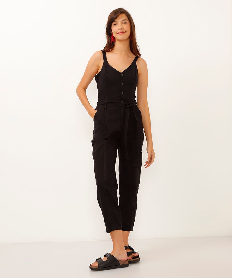 Este macacão feminino se destaca por seus detalhes funcionais e cheios de charme: