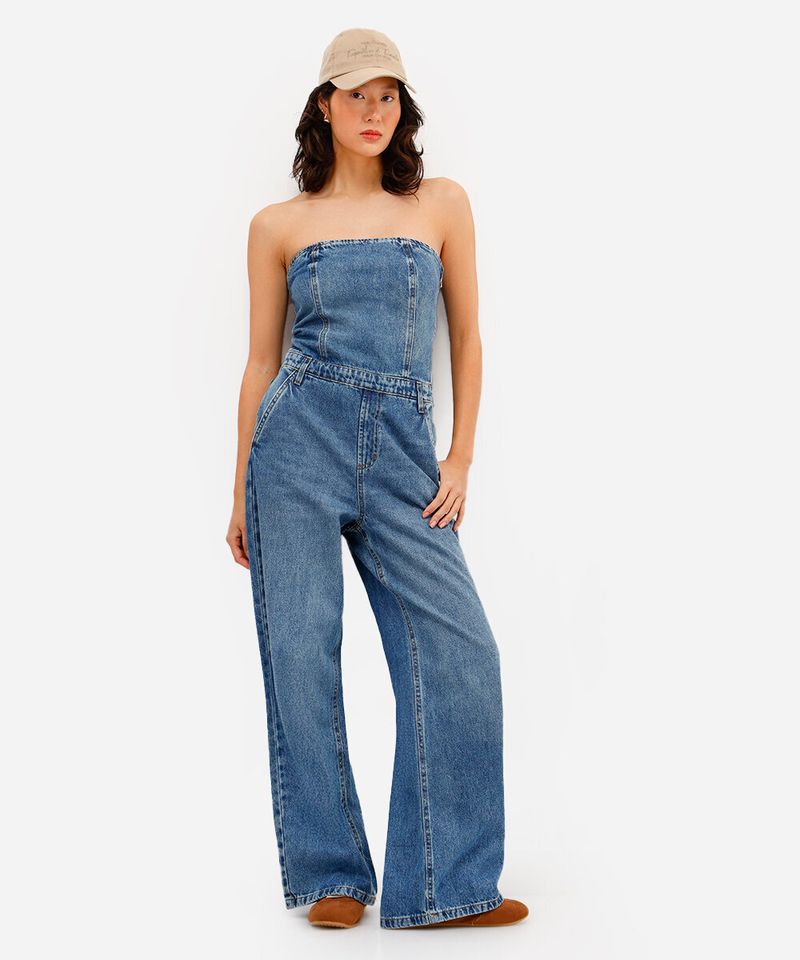Este macacão feminino jeans se destaca por seus detalhes cuidadosamente pensados: