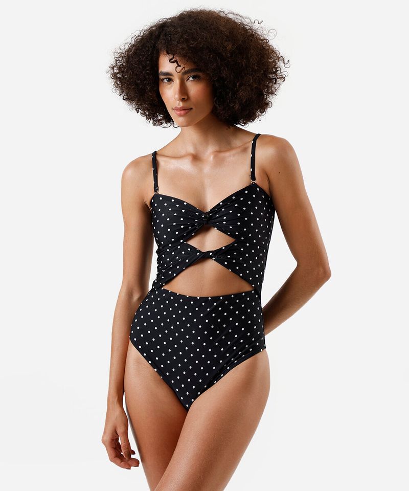 Este maiô feminino une o charme clássico da estampa de poá com a modernidade dos recortes frontais, criando uma peça única para seus dias de sol. Seu design foi pensado para oferecer um visual elegante e contemporâneo, seja na praia ou na piscina. Confeccionado em malha de poliamida com elastano, proporciona um caimento confortável que se ajusta ao corpo, além de contar com proteção UV.