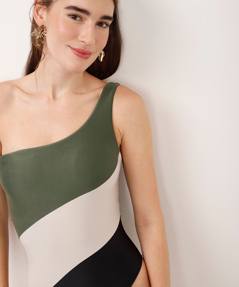 Renove seu visual de moda praia com este maiô feminino que une elegância e modernidade. O design de um ombro só é um clássico atemporal que valoriza o colo, enquanto os recortes em cores contrastantes criam um efeito visual sofisticado. Confeccionado em malha macia com proteção UV, ele garante conforto e segurança para você aproveitar os dias de sol com muito estilo.