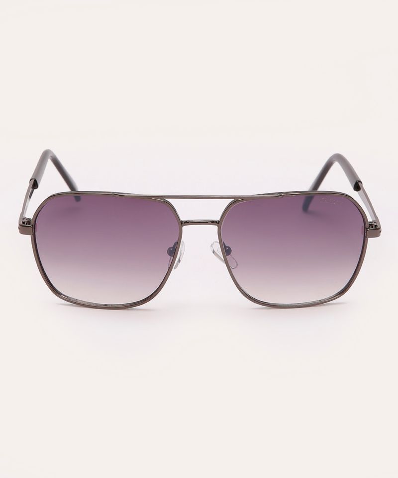 Óculos de sol masculino desenvolvido em metal prateado com formato aviador com as extremidades arredondadas. A lente na cor cinza degradê, a ponte em U e plaquetas embutidas. Com proteção da lente UVA e UVB.