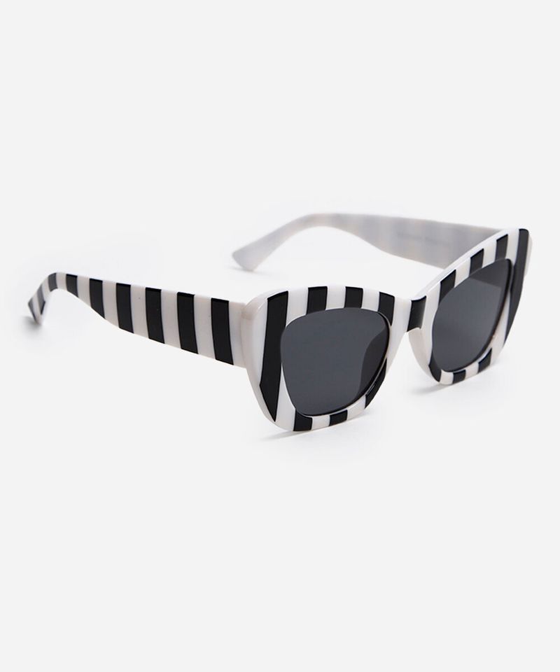 Óculos de sol de carnaval desenvolvido em acetato resistente nas cores preto e branco formando padronagem listrada, formato gatinho e as extremidades arredondadas. A lente na cor cinza, a ponte em U e plaquetas embutidas. Com proteção da lente UVA e UVB.