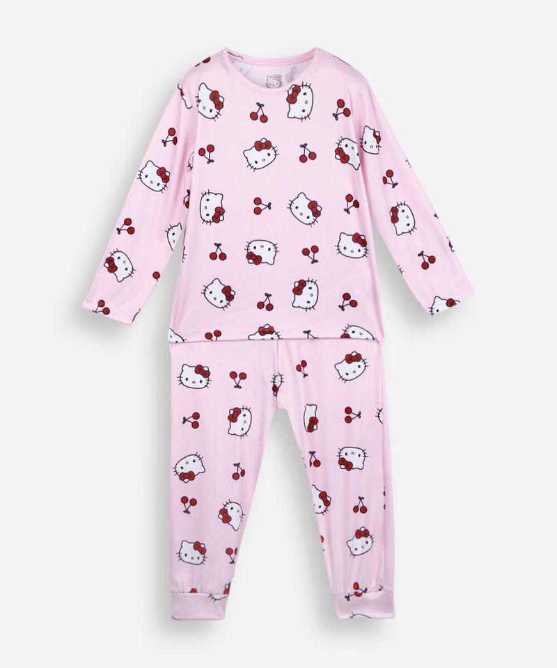 Conjunto de pijama infantil confeccionado em malha com estampa temática da "Hello kitty". Composto por blusa e calça. A blusa com modelagem reta, caimento solto mangas longas e gola redonda. A calça possui modelo jogger, caimento solto e cós com elástico embutido. Detalhe de acabamento pespontado nos punhos e nas barras. Composição: 96% poliéster 4% elastano Instruções de lavagem: - Temperatura até 40º - Não alvejar - Não secar em secadora - Secar na vertical - Passar em temperatura média - Não lavar a seco - Limpar a úmido