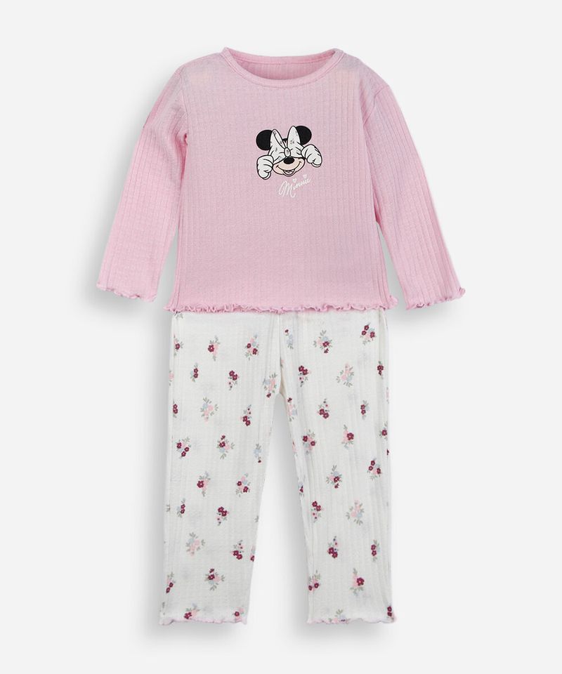 Pijama infantil confeccionado em tecido texturizado com toque leve e macio. Composto por blusa e calça. A camiseta possui decote redondo em viés, mangas longas e estampa com desenho da personagem Minnie. A calça possui cós com elástico embutido e estampa com desenho de florzinhas. Ambas as peças possuem modelagem reta e caimento levemente solto, estampas em cores contrastantes e acabamento de fru fru.