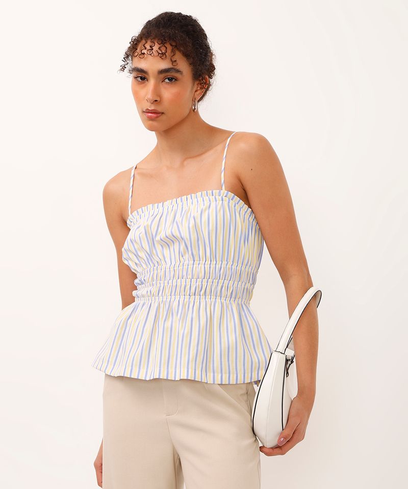 regata alça fina com franzidos listrada azul