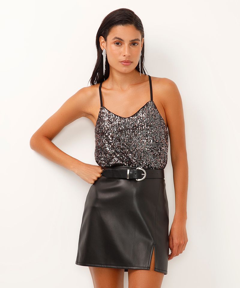 Sugestões de Uso e Combinações Esta regata de paetê é incrivelmente versátil para looks noturnos. Para uma produção poderosa, combine-a com uma saia preta de material sintético e sandálias de salto. Se a ideia é um visual mais casual chic, experimente usá-la com uma calça de alfaiataria de cintura alta ou um jeans de lavagem escura. Finalize com acessórios discretos para que o brilho da peça seja o protagonista.