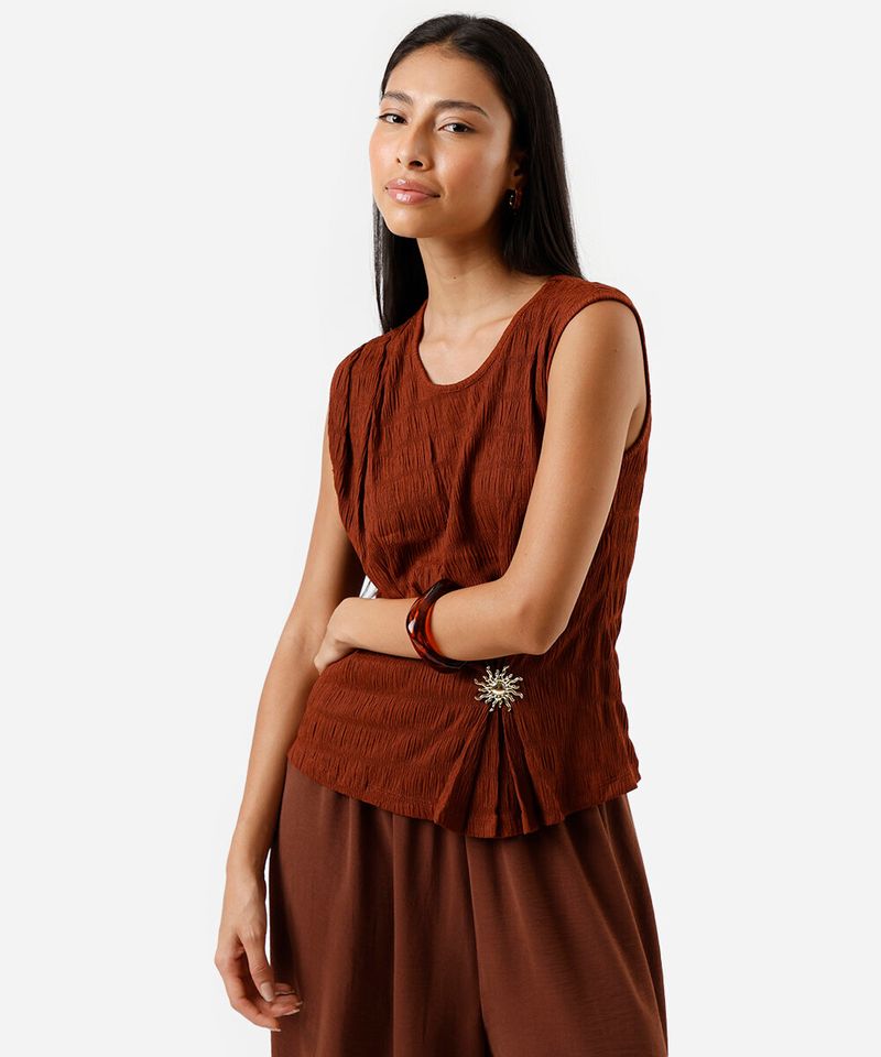 Adicione um toque de sofisticação ao seu visual com esta regata feminina. Confeccionada em uma malha texturizada com caimento leve, a peça se destaca pelo seu design elegante e confortável. O detalhe drapeado na parte frontal, finalizado com um delicado aviamento, cria um efeito visual único que valoriza qualquer produção.