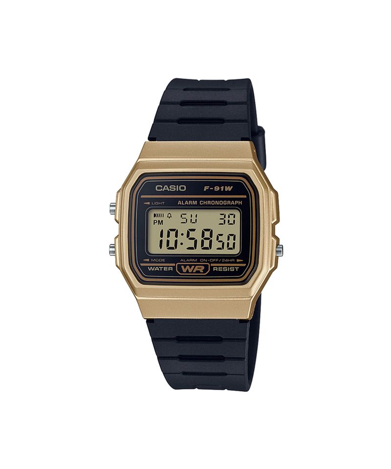 Relógio masculino Casio digital f-91wm-9adf dourado. Desenvolvido em plástico com pulseira preta, visor digital positivo e caixa resina. Possui resistência à água de 3atm e mecanismo digital.