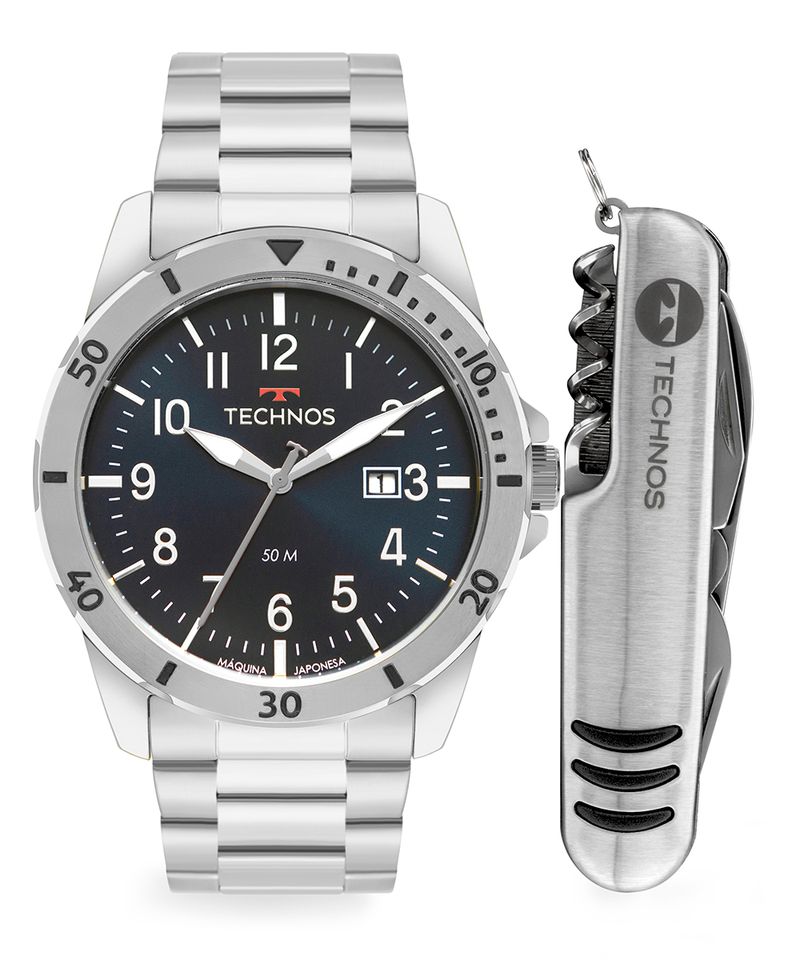 Para o homem que valoriza precisão e funcionalidade, este kit da Technos é a escolha ideal. Ele une um relógio analógico de design clássico com a praticidade de um canivete multifuncional, perfeito para o dia a dia e para momentos de aventura. Com sua pulseira de aço e visor sofisticado, o relógio masculino transita facilmente entre compromissos casuais e formais.