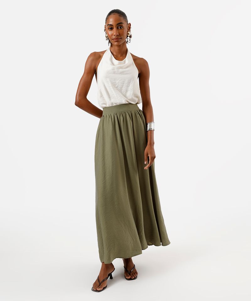 Descubra a elegância e o conforto desta saia longa, uma peça essencial para criar looks cheios de movimento e estilo. Confeccionada em um tecido leve de viscose com uma textura sutil, esta peça oferece um caimento fluido e solto que acompanha seus passos com leveza. Perfeita para compor visuais que vão do casual ao sofisticado, é um item versátil para o seu guarda-roupa.