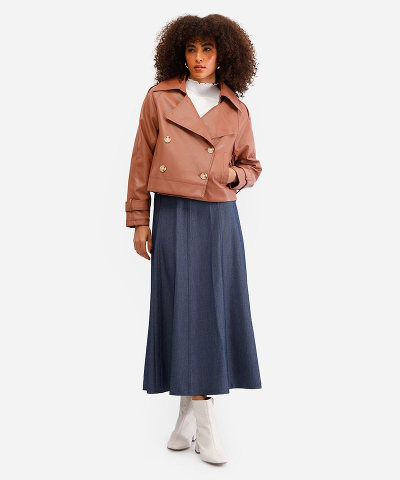 Esta saia midi é uma peça versátil para criar produções elegantes e cheias de movimento. Com um caimento fluido que valoriza o caminhar, ela combina a sofisticação da modelagem evasê com a versatilidade de um tecido confortável com aspecto de jeans. Sua cintura alta define a silhueta, tornando-a perfeita para compor looks que vão do casual ao formal com muita facilidade.