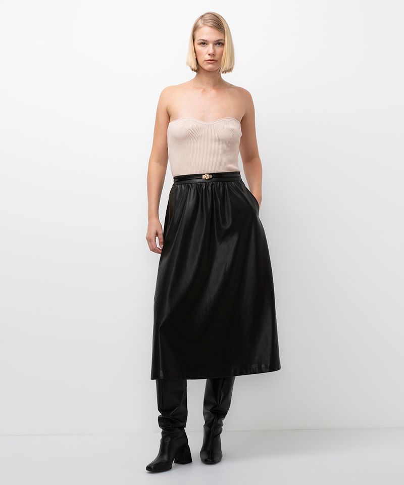 Eleve seu estilo com esta saia midi evasê, uma peça que une sofisticação e conforto de forma única. Confeccionada em material com efeito de couro, ela oferece um toque moderno e um caimento fluido que valoriza o movimento. Sua versatilidade permite criar desde looks de trabalho até produções mais elaboradas para a noite, tornando-se um item indispensável no guarda-roupa feminino.