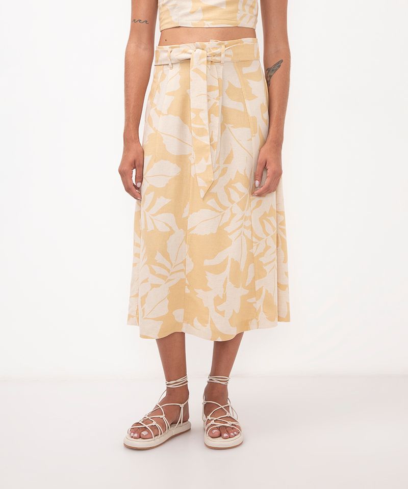 Sugestões de Uso e Combinações Para um look coordenado e cheio de estilo, combine esta saia midi com o top cropped da mesma estampa. Se preferir uma produção mais casual, aposte em uma blusa básica ou uma regata em tons neutros. Nos pés, sandálias rasteirinhas, de amarração ou anabelas complementam o visual com elegância. Finalize com acessórios como bolsas de palha e brincos delicados.