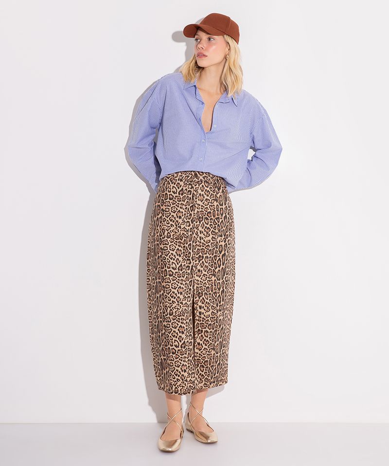 Adicione um toque de atitude e sofisticação ao seu guarda-roupa com esta saia midi de sarja. A estampa animal print, um clássico atemporal, ganha destaque nesta peça versátil, perfeita para criar looks que vão do casual ao elegante. Confeccionada em sarja de algodão, ela oferece um caimento estruturado e confortável, ideal para acompanhar você em diversas ocasiões.