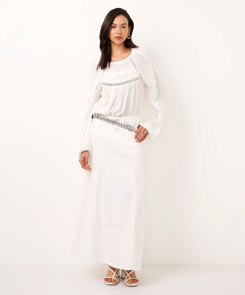 Esta saia longa se destaca por seus detalhes que unem estilo e conforto: