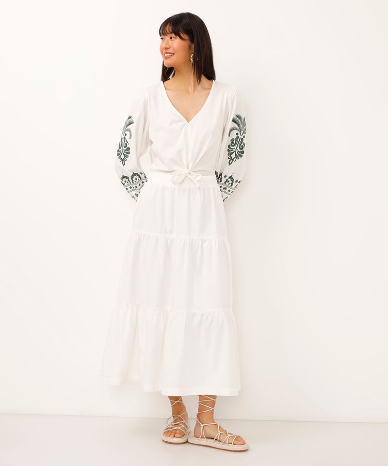 Esta saia midi se destaca por seus detalhes que unem estilo e conforto: