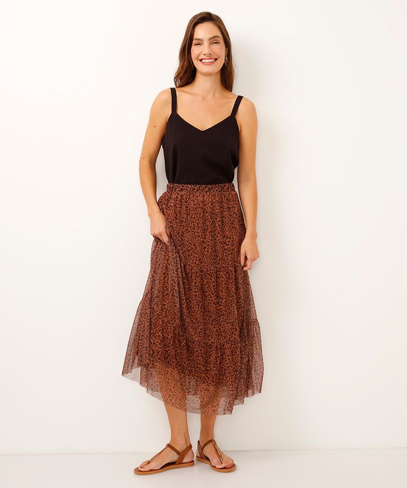 Adicione um toque de ousadia e leveza ao seu visual com esta saia midi. Confeccionada em tule com uma estampa animal print atemporal, esta peça combina fluidez e conforto para criar looks cheios de personalidade. Sua modelagem com camadas traz movimento e um charme especial, sendo perfeita para diversas ocasiões, do casual ao mais elaborado.