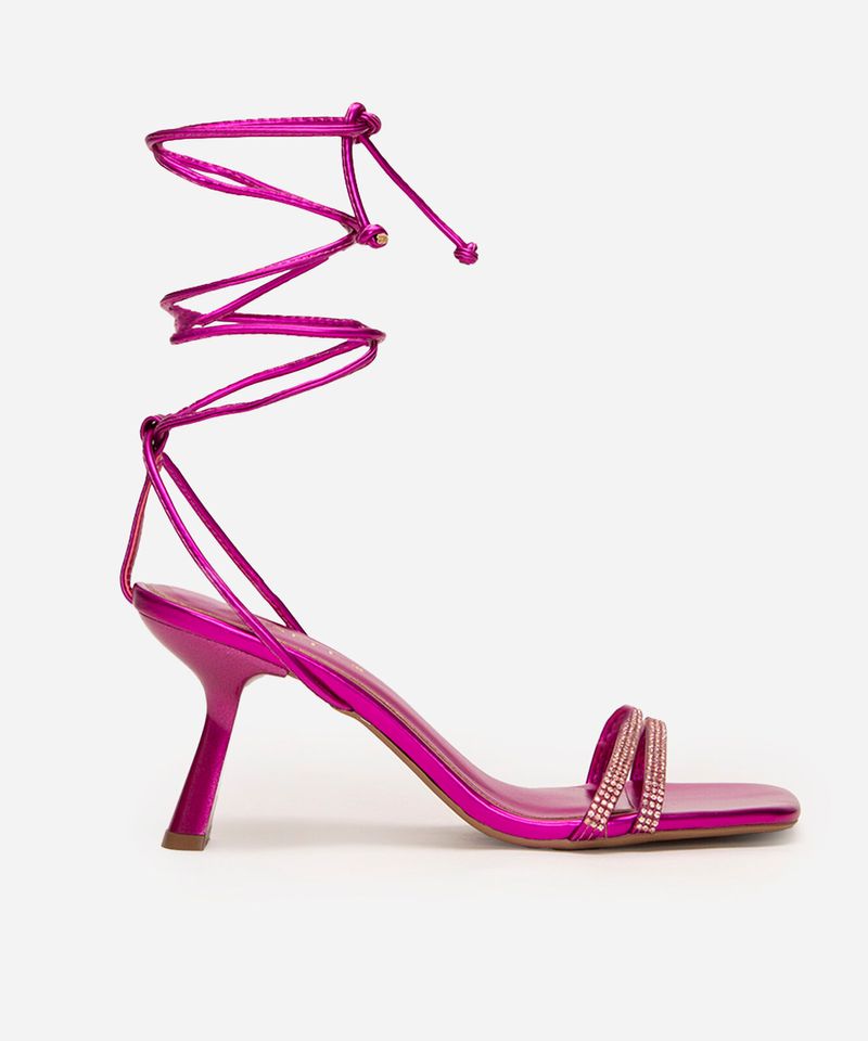 Eleve suas produções com uma sandália que é pura sofisticação e glamour. Este modelo metalizado foi criado para quem ama um toque de brilho, combinando a tendência das tiras com strass e a elegância da amarração no tornozelo. Perfeita para eventos noturnos e ocasiões especiais, esta sandália de salto garante um visual marcante e cheio de personalidade.