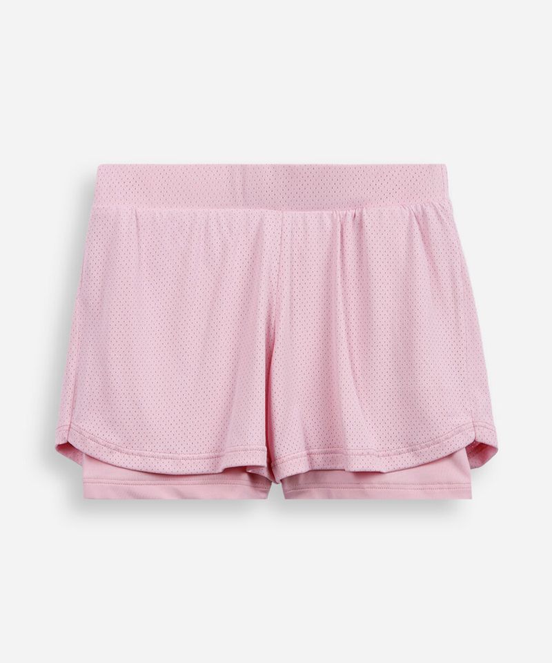 Short infantil confeccionado em malha de poliamida. A peça possui cintura alta, cós elástico, forro, caimento solto e acabamento pespontado.