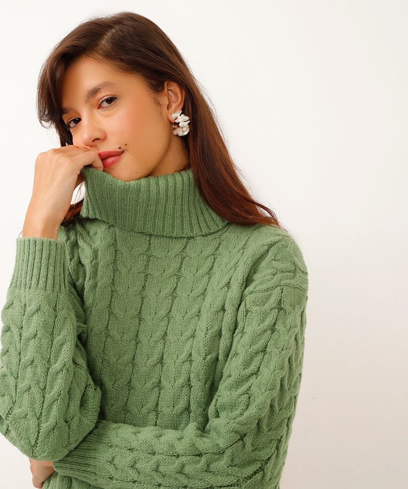 suéter de tricot cropped gola alta verde