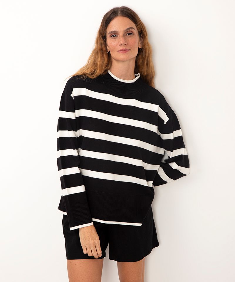 Sugestões de Uso e Combinações Para um visual descontraído, combine este suéter listrado com uma calça jeans de modelagem reta e tênis. Se a ocasião pede um toque mais elegante, aposte em uma calça de alfaiataria ou shorts de tecido plano e sapatos como mocassins ou mules. É uma peça versátil que transita facilmente entre o trabalho e o lazer, permitindo criar looks modernos e cheios de personalidade.
