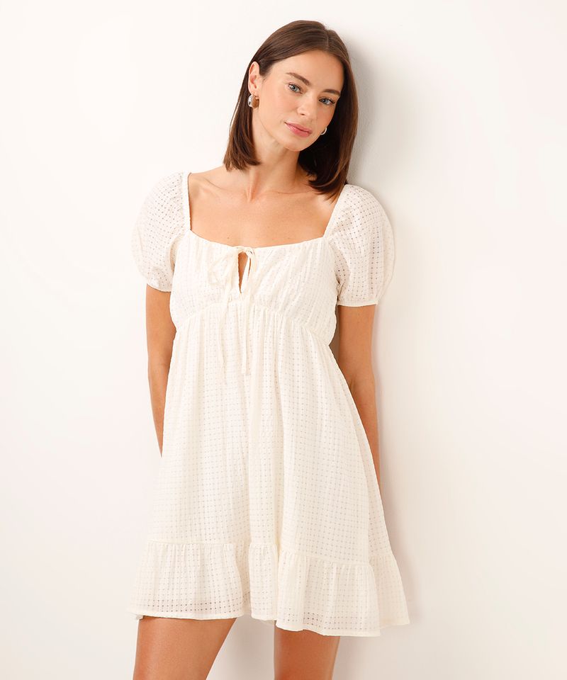 Este vestido curto é a escolha perfeita para quem busca um visual romântico e moderno. Com um design delicado, o vestido com manga bufante valoriza o visual com leveza e feminilidade. Confeccionado em tecido plano texturizado, ele oferece um caimento solto e confortável, ideal para diversas ocasiões, desde um passeio durante o dia até um encontro especial.