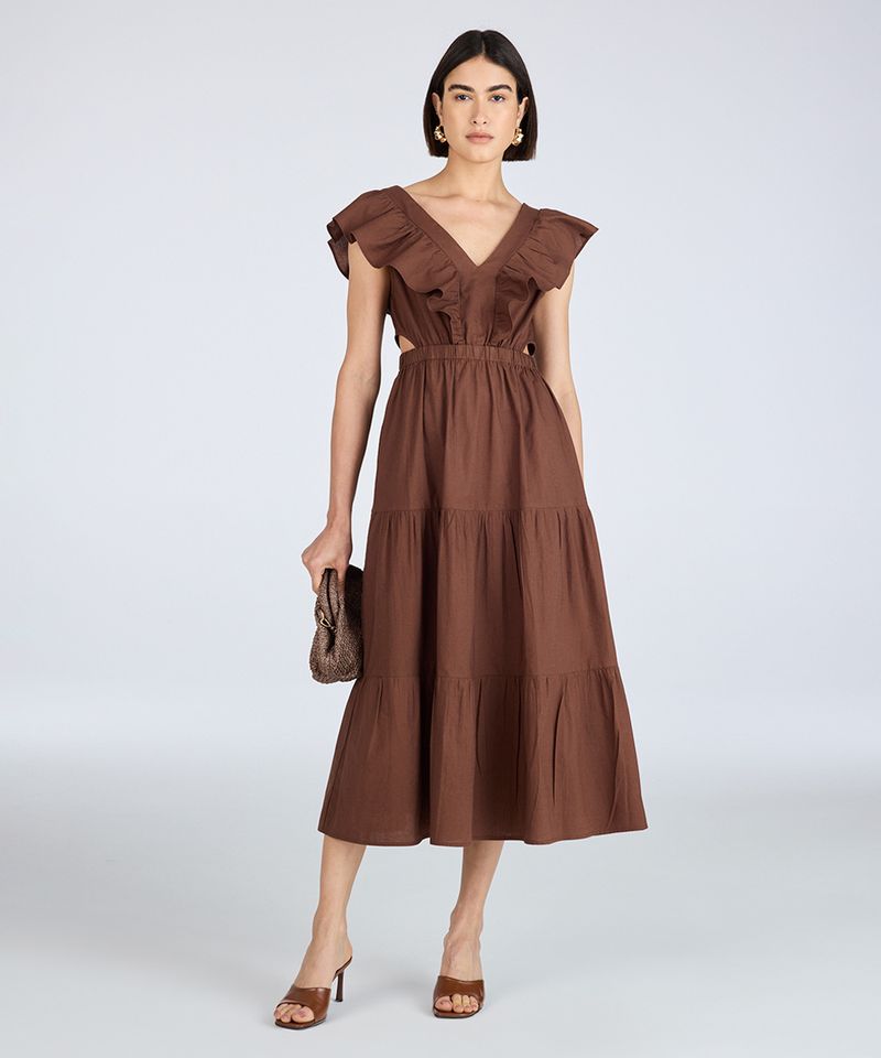 Este vestido midi une o romantismo dos babados com a modernidade dos recortes, criando uma peça única para o seu guarda-roupa. Confeccionado em tecido de algodão, ele oferece um caimento leve e confortável, ideal para diversas estações. Seu design versátil permite transitar entre eventos diurnos e noturnos com muita elegância e estilo.