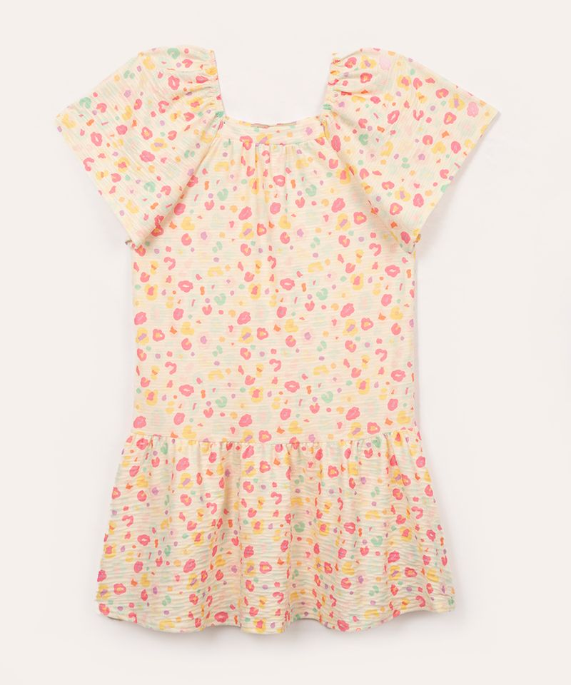 Este vestido infantil é a escolha perfeita para um visual alegre e cheio de estilo. Confeccionado em uma malha texturizada e confortável, ele permite que as pequenas brinquem com total liberdade de movimento. A estampa de animal print em tons coloridos dá um toque moderno e divertido para a peça, ideal para passeios e ocasiões especiais.