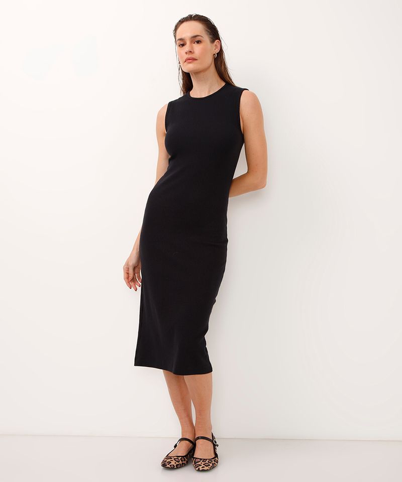 Este vestido midi canelado é a peça que une conforto e versatilidade em um design atemporal. Confeccionado em uma malha de algodão com toque macio, seu caimento justo se adapta ao corpo de forma confortável e elegante. Ideal para compor looks que vão do casual ao sofisticado, este vestido preto é um item essencial no guarda-roupa feminino.