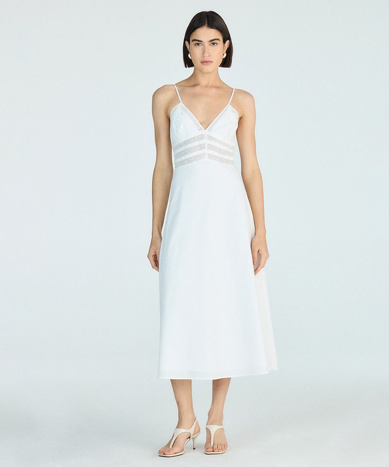 Este vestido midi é a escolha perfeita para quem busca uma peça elegante e cheia de charme. Confeccionado em tecido plano de algodão, ele oferece um toque suave e um caimento leve, ideal para diversas estações. Sua modelagem evasê acinturada cria um visual feminino e sofisticado, tornando-o uma excelente opção de roupa feminina para eventos especiais.