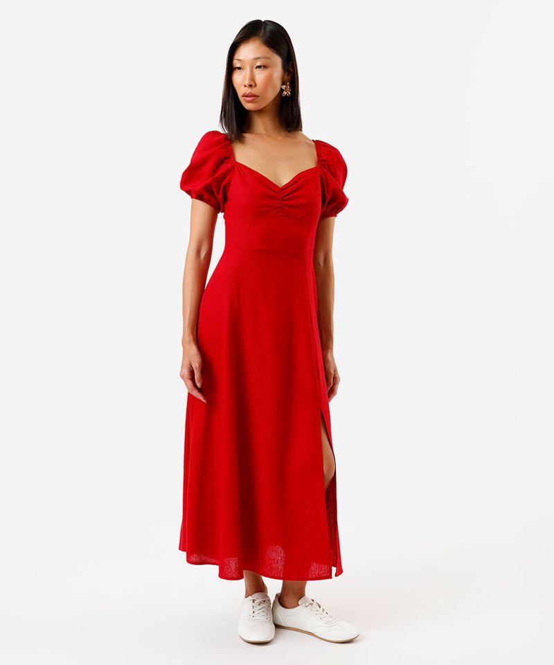 Este vestido midi une o charme romântico com um toque moderno, sendo uma peça versátil para diversas ocasiões. Confeccionado em uma mistura de viscose e linho, ele oferece um caimento leve e um toque suave, ideal para os dias mais quentes. O design com mangas bufantes e decote coração valoriza o colo de forma delicada, criando um visual elegante e feminino.