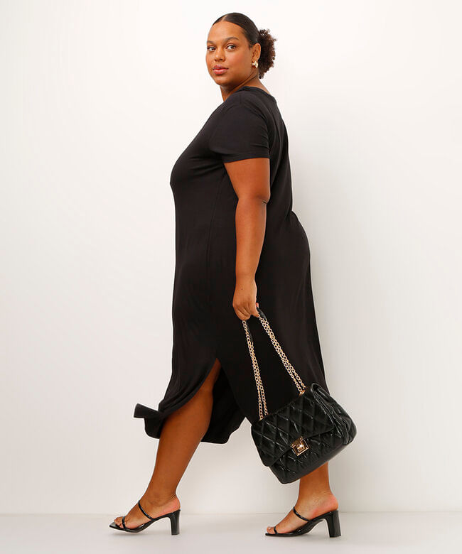 Este vestido midi plus size une conforto e elegância em um design versátil, ideal para diversas ocasiões do seu dia a dia. Feito em malha de viscose com elastano, ele oferece um toque macio e um caimento fluido que garante liberdade de movimento. Uma peça prática e cheia de estilo para o seu guarda-roupa.